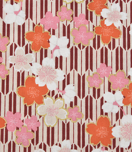 綿100%(シーチング)。捺染。時代劇でも良く目にする「矢羽柄」と「桜」の2つの柄が相性良くマッチングしたデザインとなります。矢羽は射た矢が戻ってこないといわれることから、縁起柄として多くの和柄衣装にも用いられております。金縁の桜もアクセントに映えています。